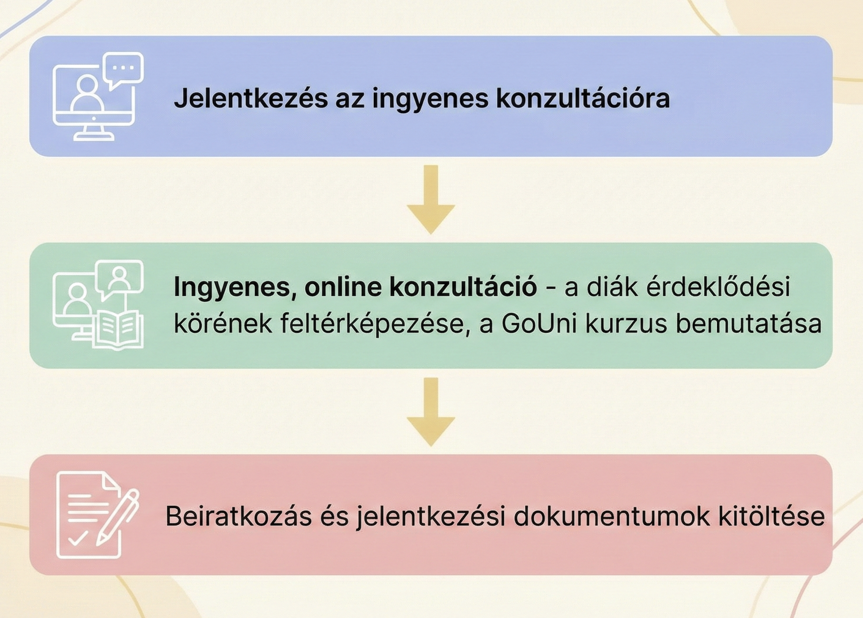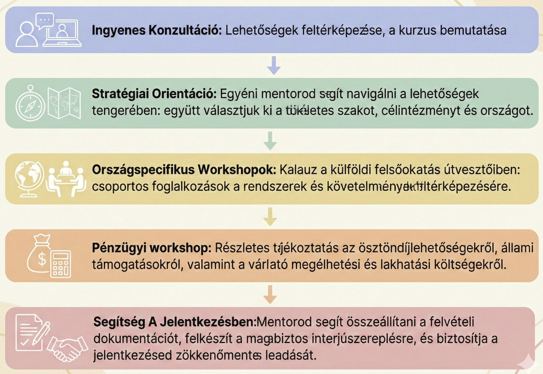A GoUni program a külföldi egyetemi jelentkezés minden lépéséhez biztosít felkészítést. A diákok egyedi akadémiai útját személyre szabott mentorálással támogatjuk. A mentor segít a tanulónak feltérképezni érdeklődési körét, majd ezen területekhez igazodó egyetemi szakokat kiválasztani. Diákjainkat végigkísérjük a teljes felvételi eljáráson, ami magába foglalja: